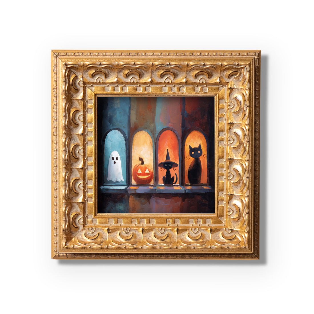 Halloween Friends Mini Oil Painting, Ghost Jack-o'-lantern Black Cat Art, Spooky Gothic Wall Decor, Tiny Framed Original Artwork