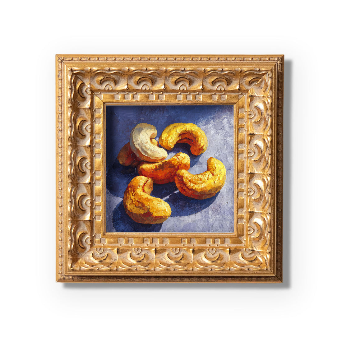 Still life Cashews Oil Painting, Small Original Hand Painted Art, Dining Room Wall Art Decor, Gift for Friends, 5X5 Gold Framed Artwork