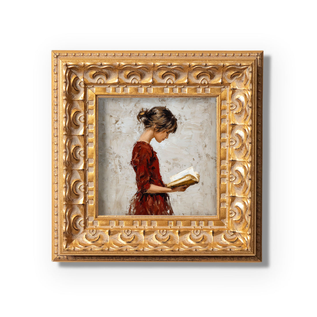 Small Original Oil Painting, Hand Painted Artwork, Reading Room Wall Art Decor, Still life, 5X5 Gold Framed Art, Gift for Friends, Book Girl