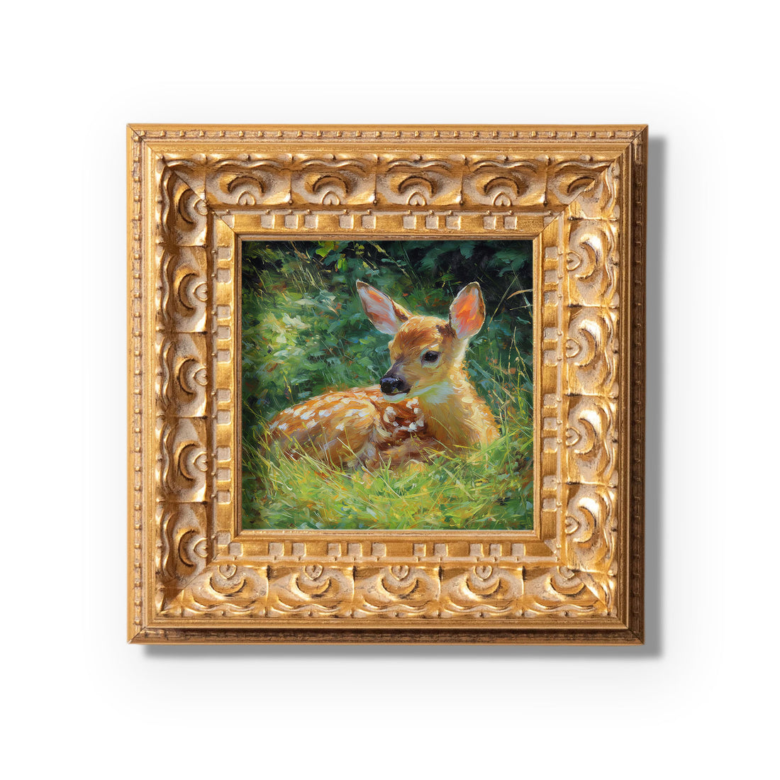 Hand Panted Fawn Oil Painting, Original Art, Living Room Wall Art Decor, 5X5 Gold Framed Artwork, Still life Wildlife, Gift for friends