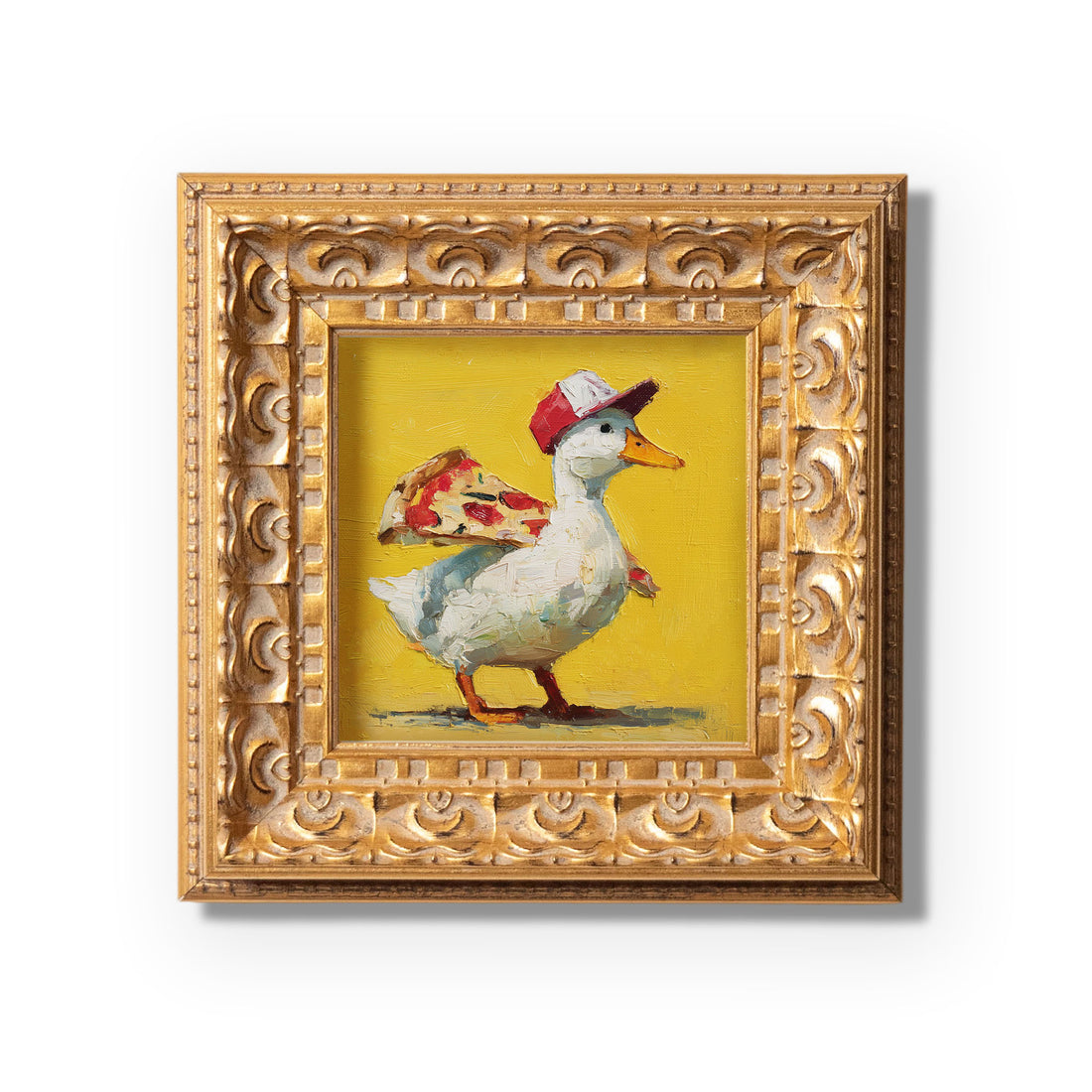 Small Original Hand Painted, Pizza Ducks Oil Painting, Living Room Wall Art Decor,5X5 Gold Framed Artwork, Christmas Gift