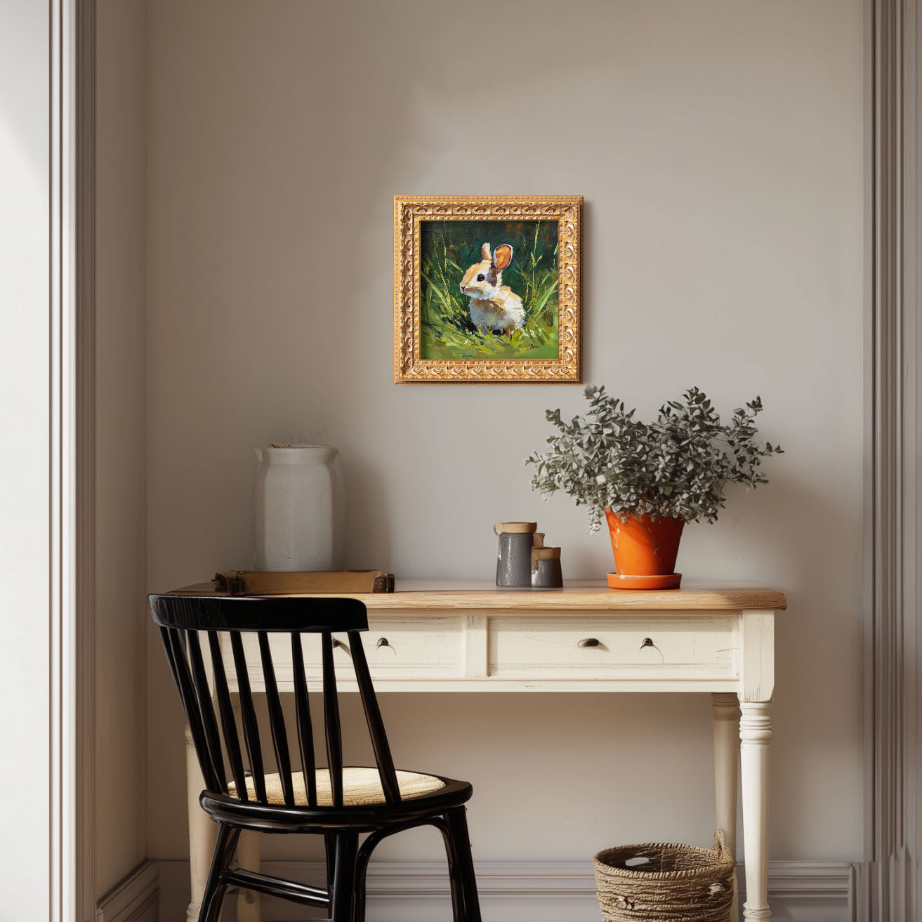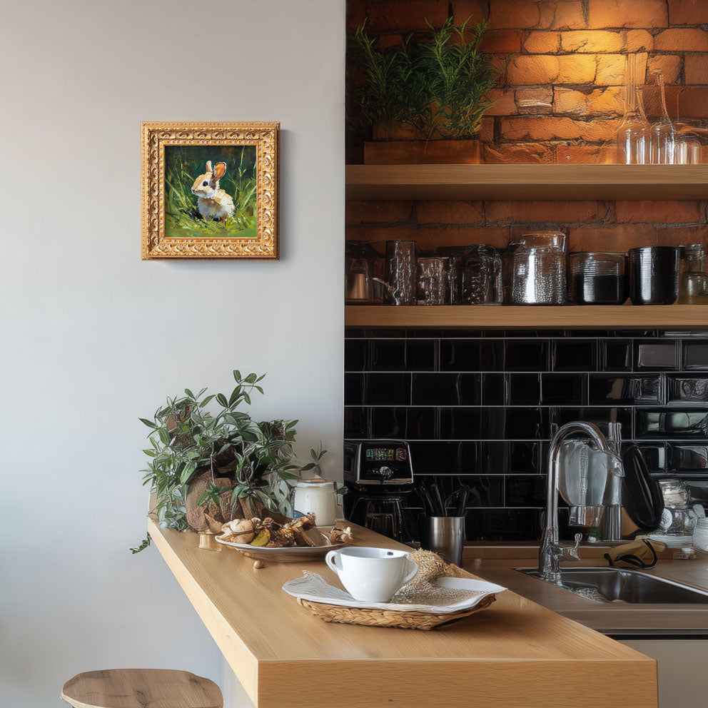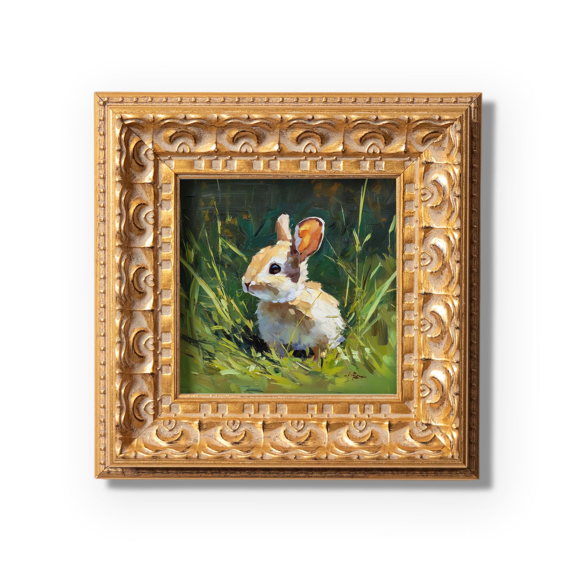 Hand Panted Rabbit Oil Painting, Original Wildlife Art, Home Wall Art Decor, 5X5 Gold Framed Artwork, Still life Bunny , Gift for friends