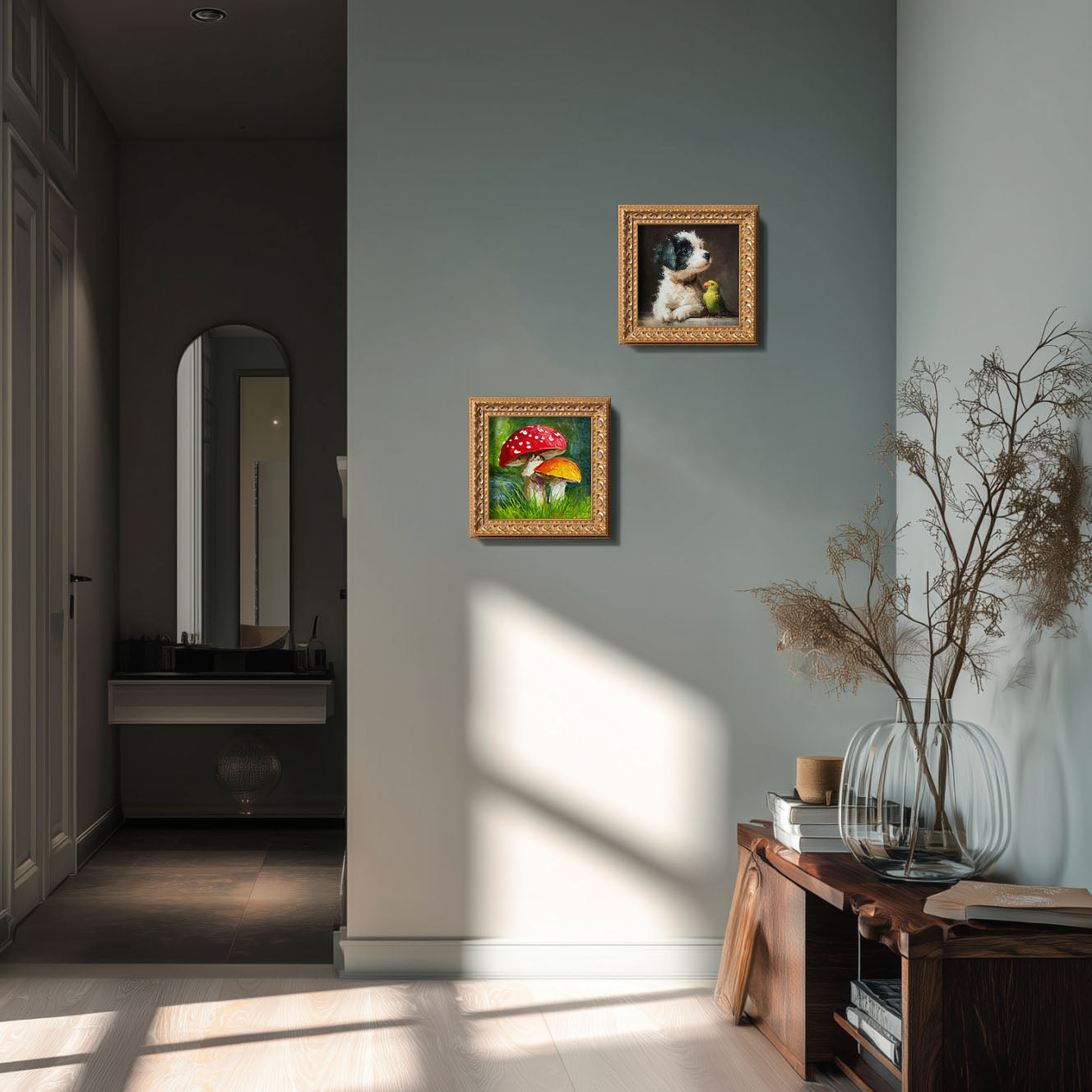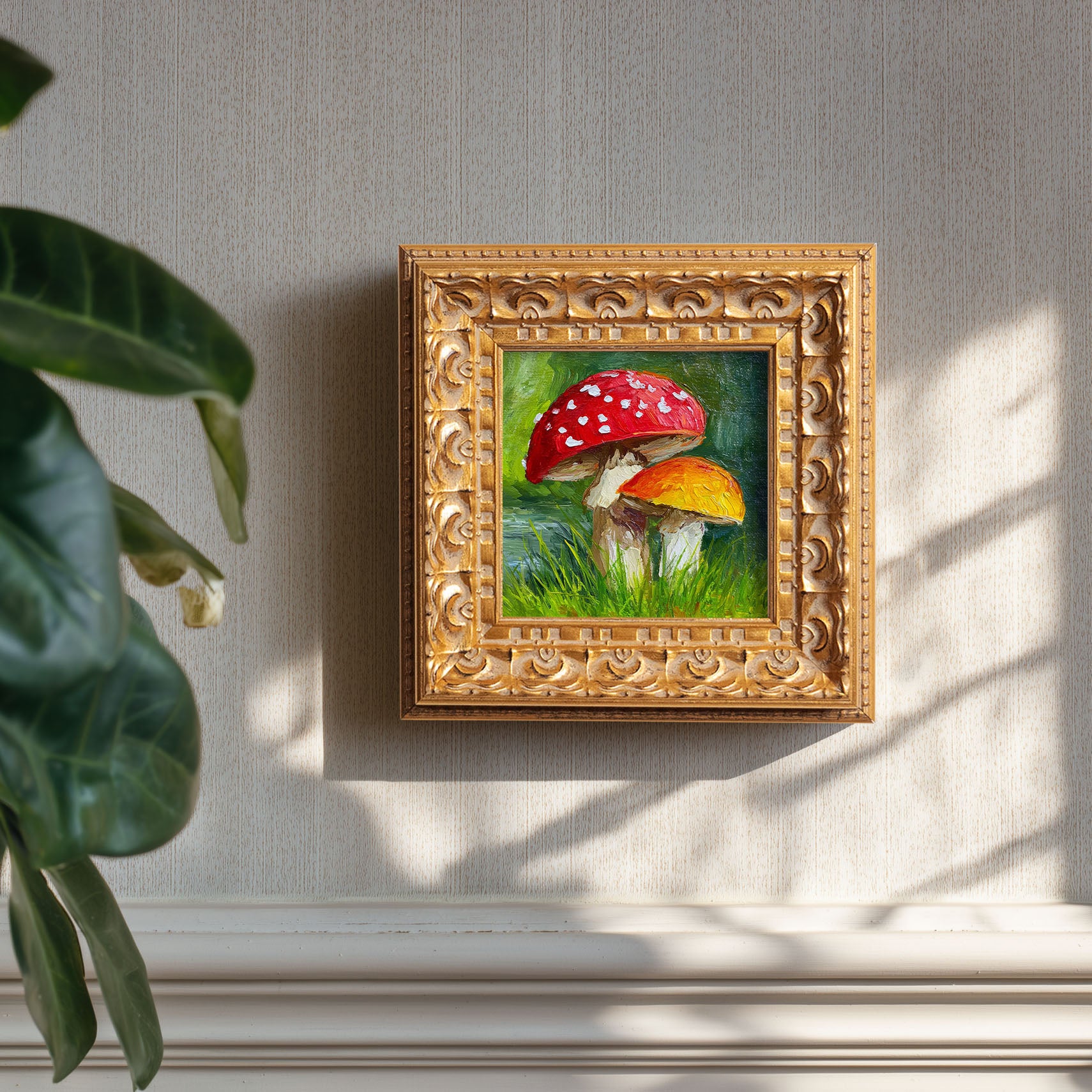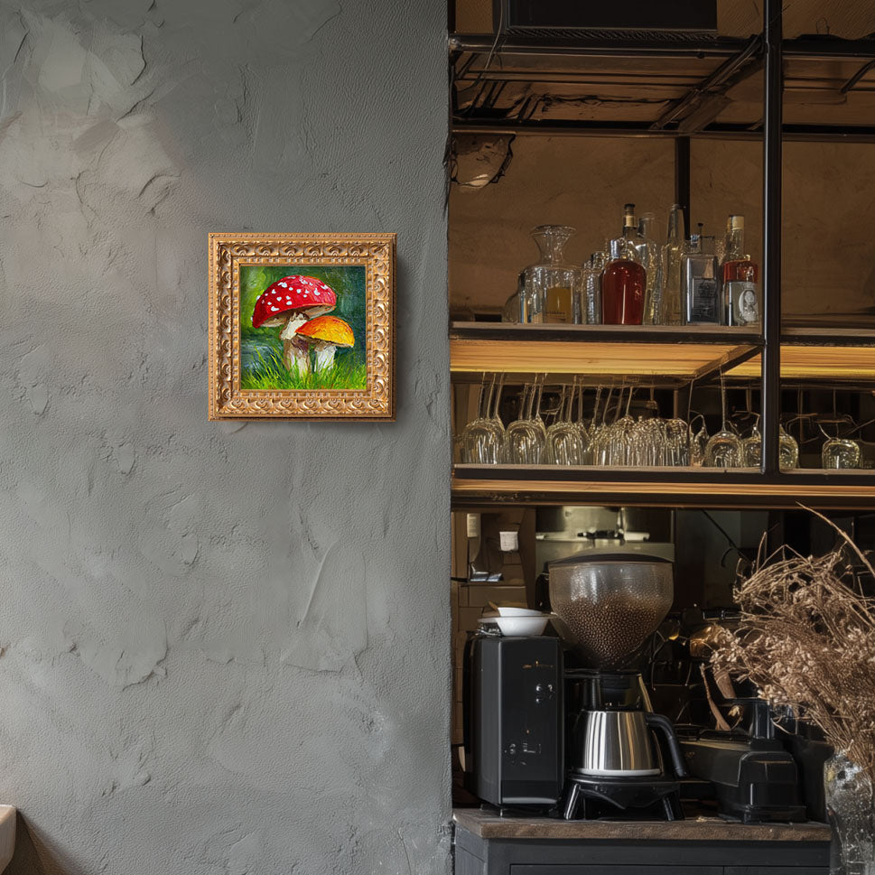 Original Red Mushroom Oil Painting, Whimsical Forest Wall Art, Hand Painted Ornate Gold Frame Home Decor, Quirky Living Room Decoration, Gift For Friends