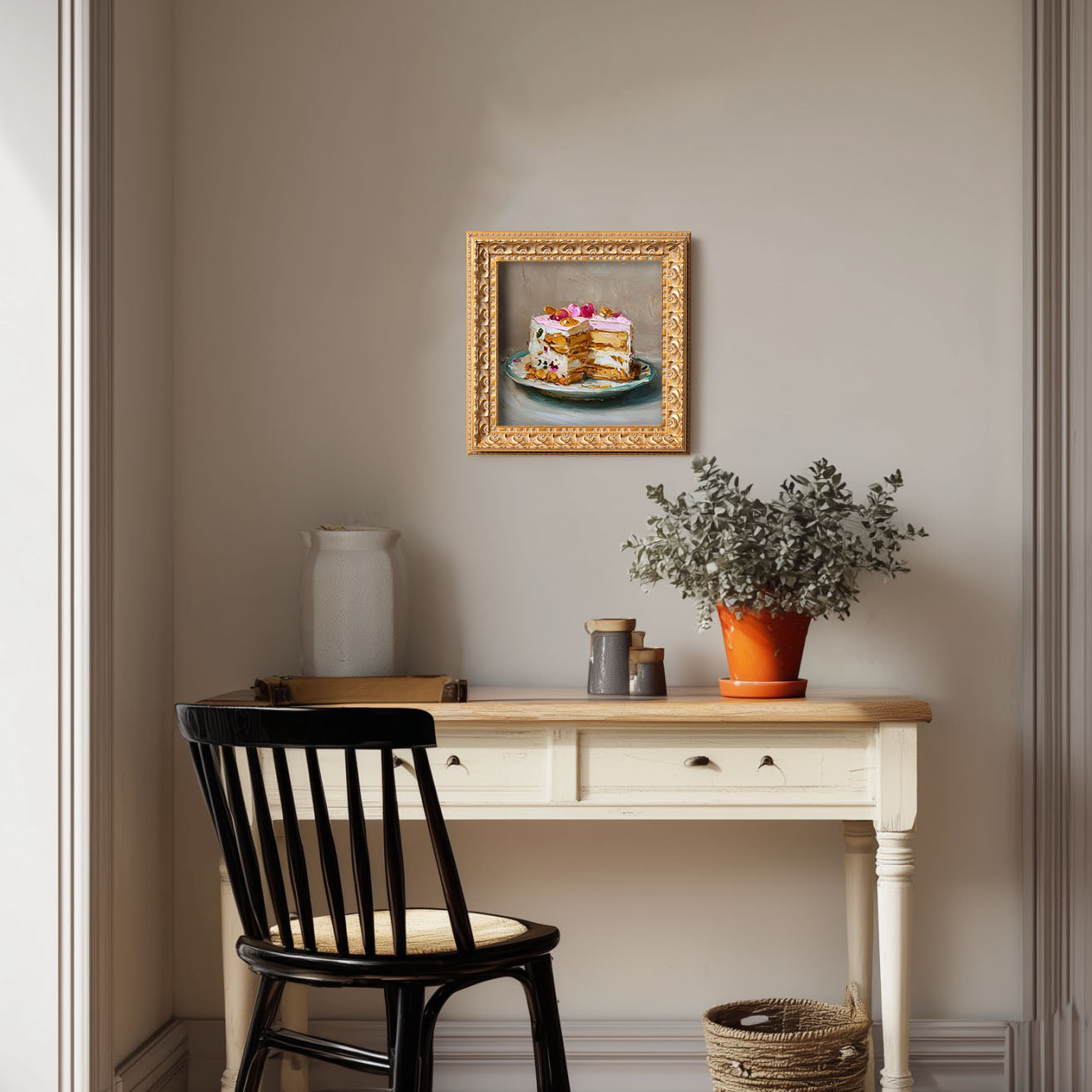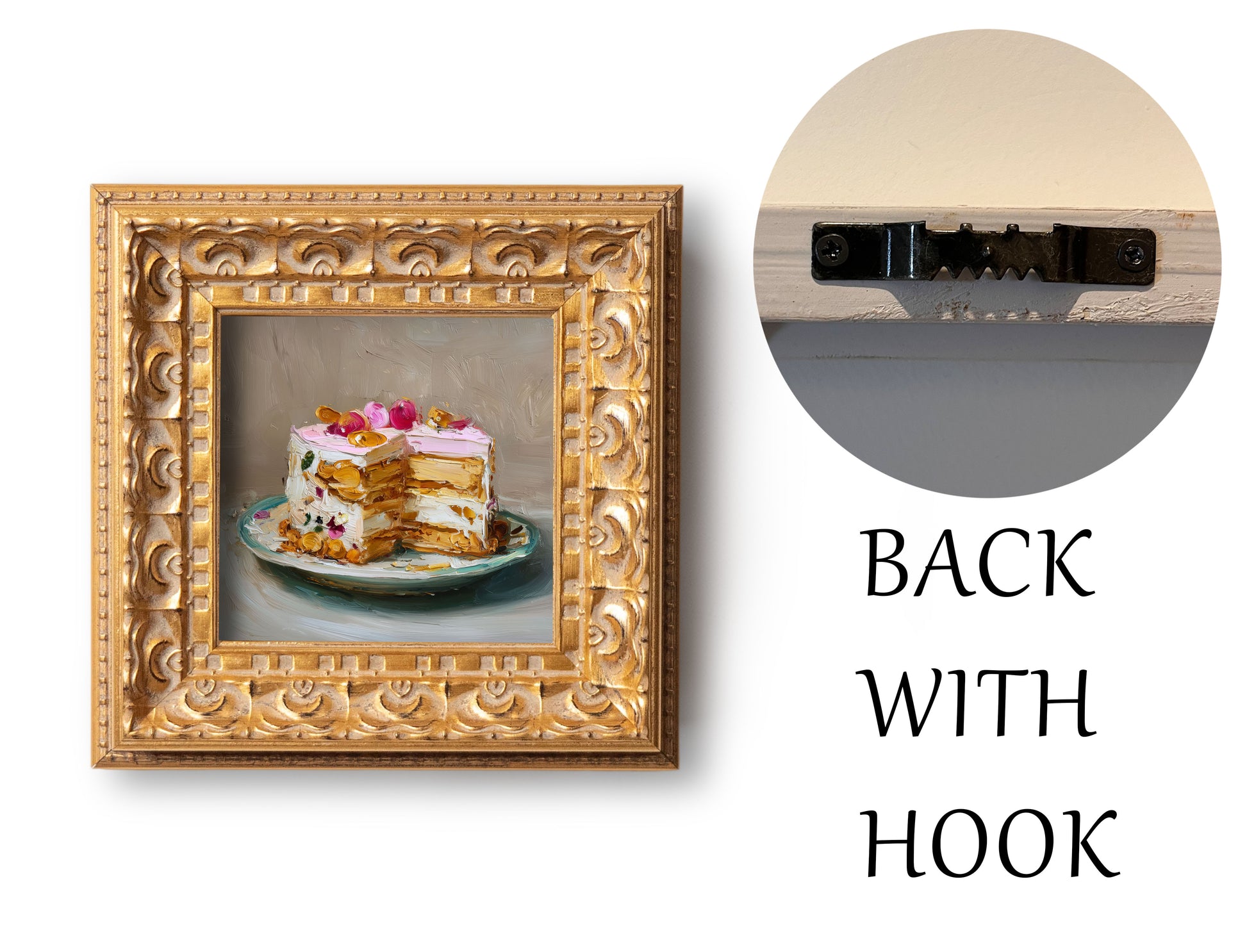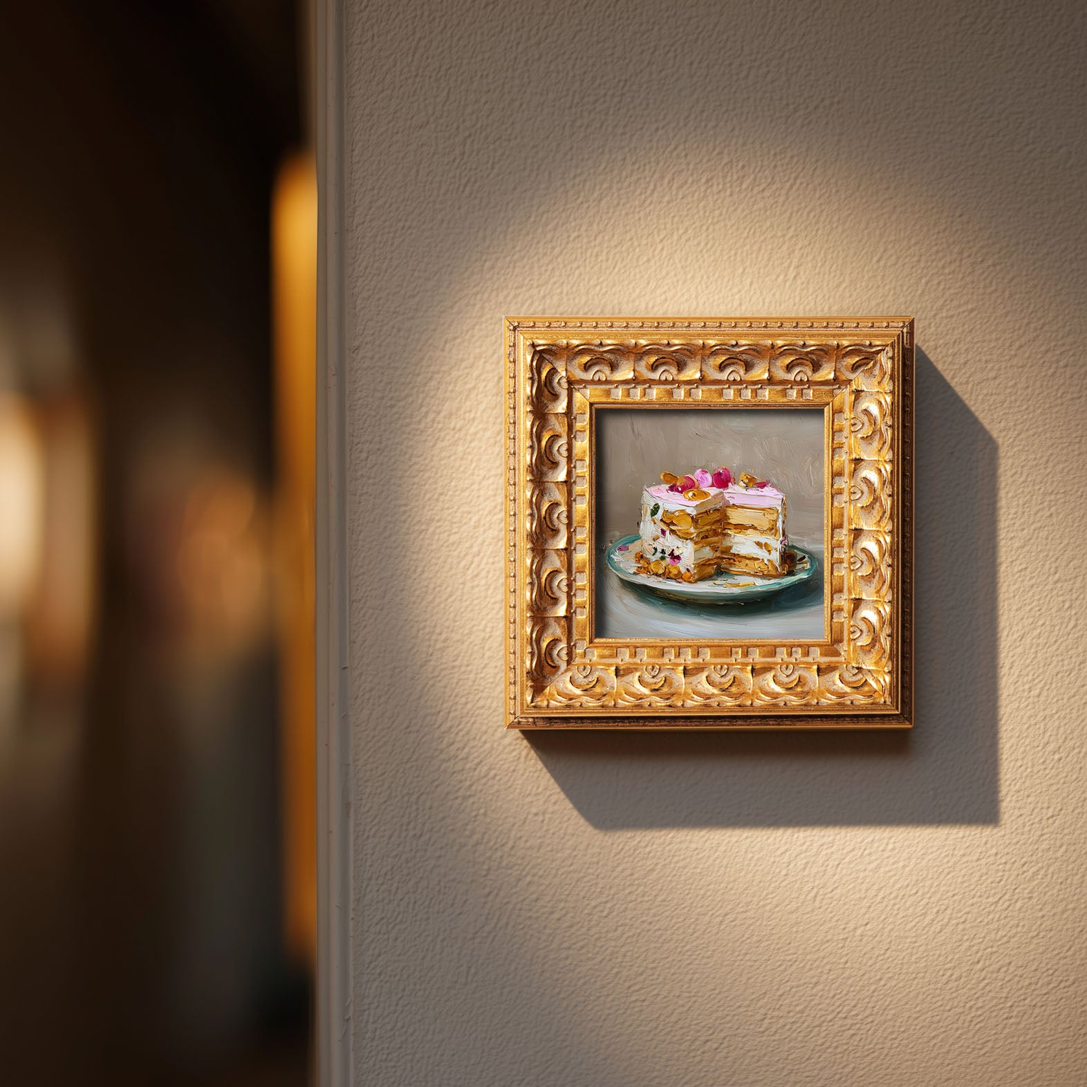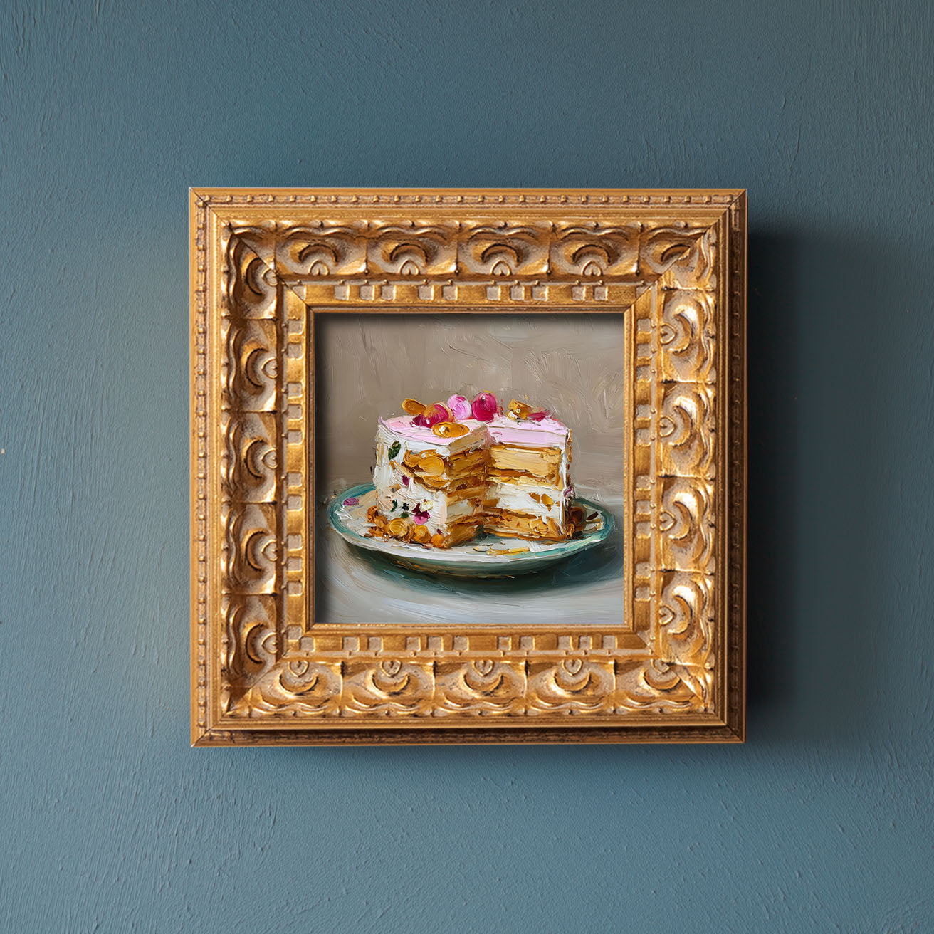 Original Rose Petal Cake Oil Painting, Elegant Kitchen Wall Art, Hand Painted Ornate Gold Frame Home Decor, Charming Dining Room Decoration, Gift For Friends