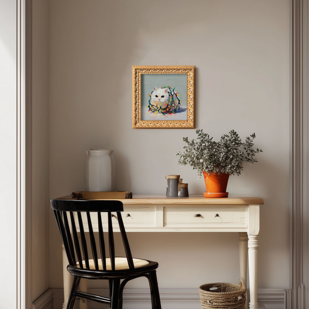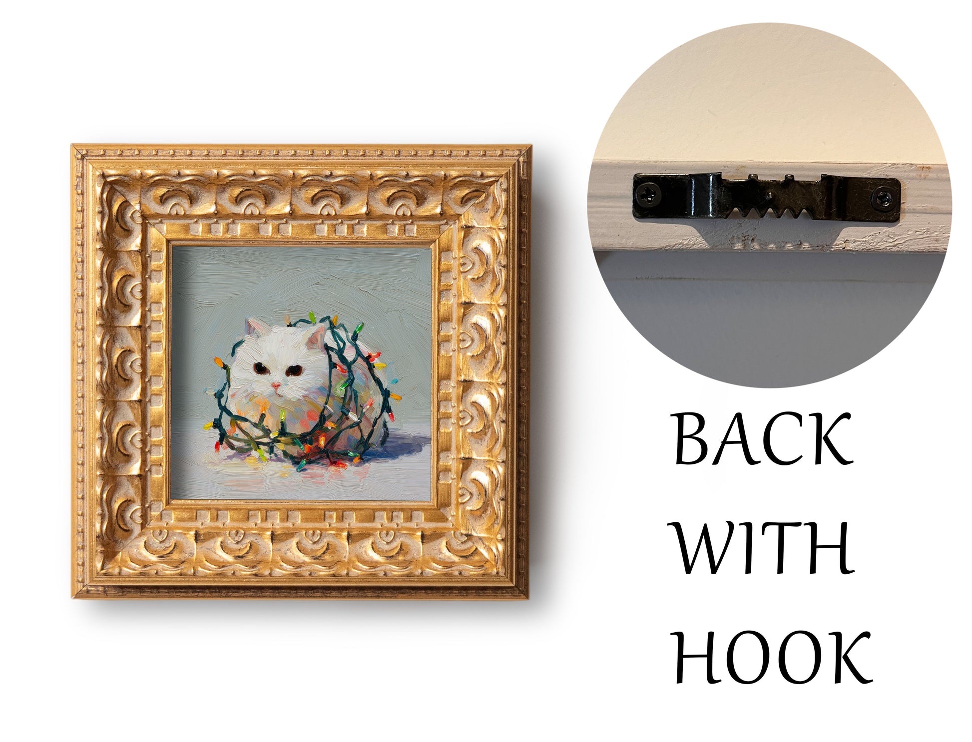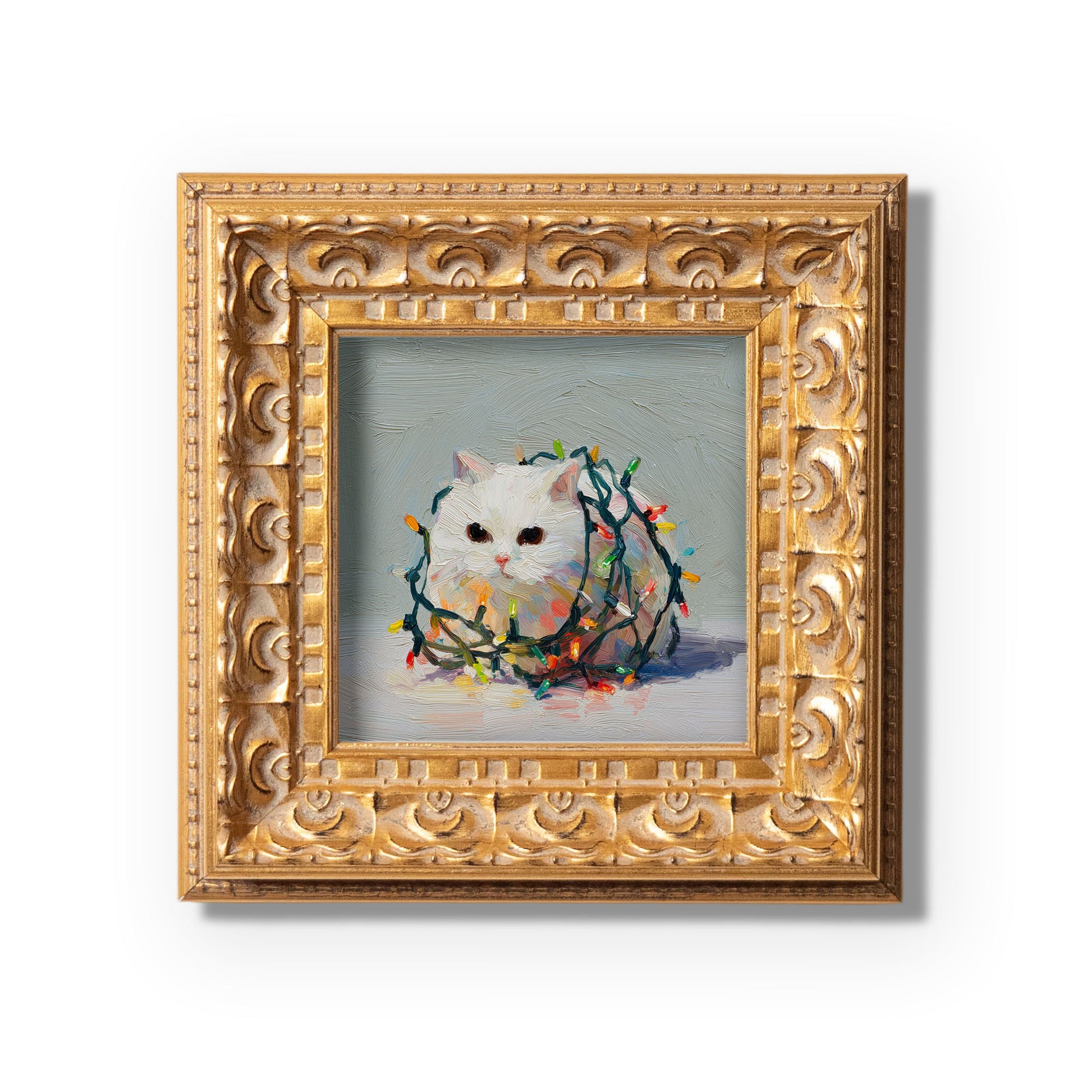 Small Christmas Lights Cat Oil Painting, Original Hand Painted, Custom Kitty Portrait, Holiday Wall Art, Winter Decor, Christmas Gift