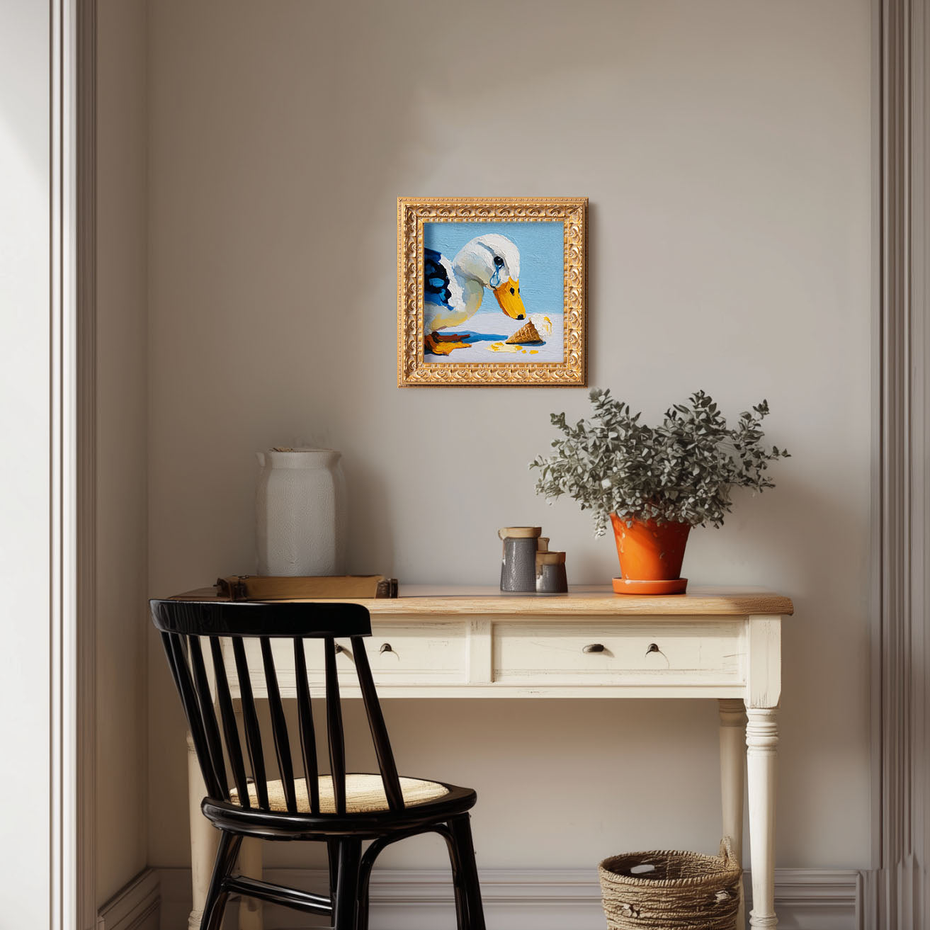 Small Original Hand Painted, Crying Duck Oil Painting, Living Room Wall Art Decor, 5X5 Gold Framed Artwork, Christmas Gift for Friends