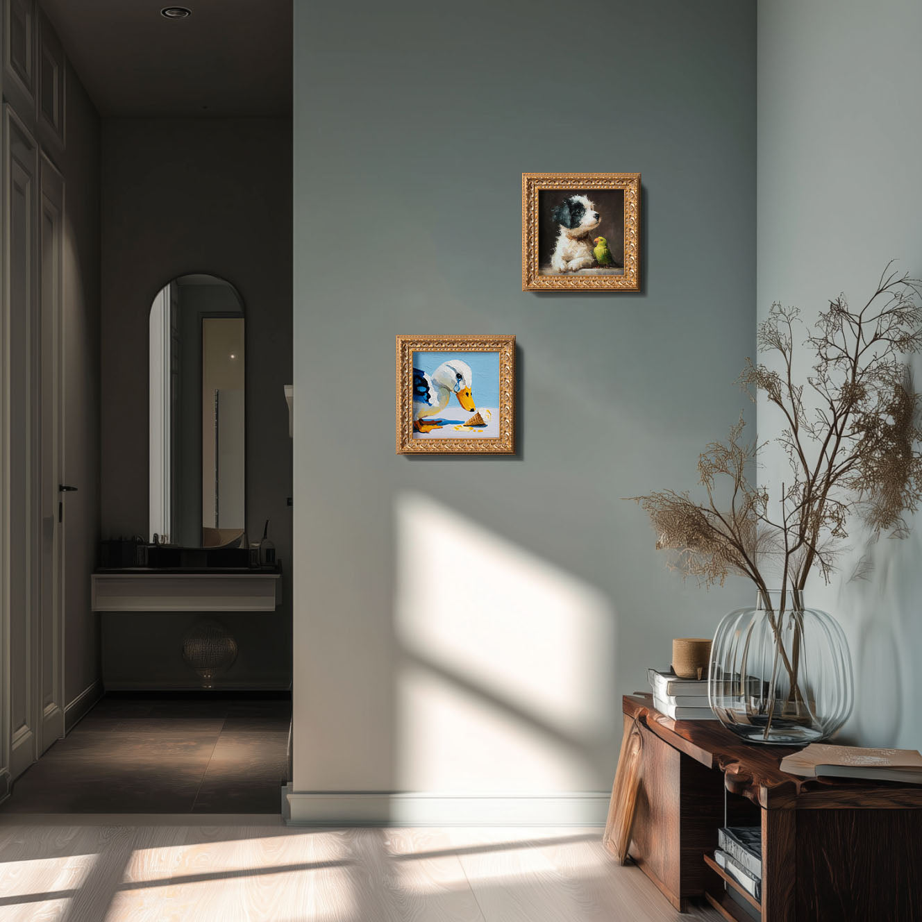 Story: Ghanaian-American artist Kwame Asante creates dynamic figurative works that celebrate Black joy and everyday beauty. His distinctive style combines vibrant, saturated colors with graceful elongated forms, influenced by both West African sculpture and contemporary fashion photography. Working between Accra and Brooklyn, Kwame's recent series "Sunshine State" depicts intimate moments of leisure and connection within the African diaspora. His use of radiant gold leaf accents pays homage to traditional Ghanaian adornment while creating stunning visual impact in modern interiors.