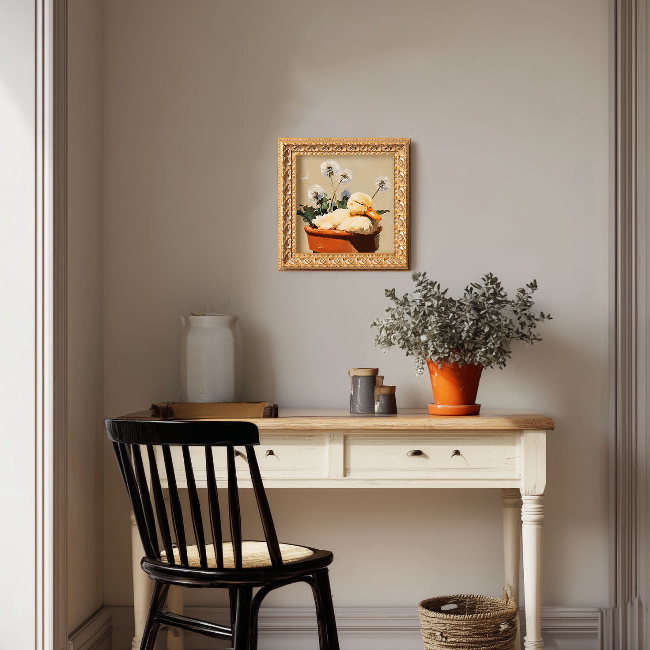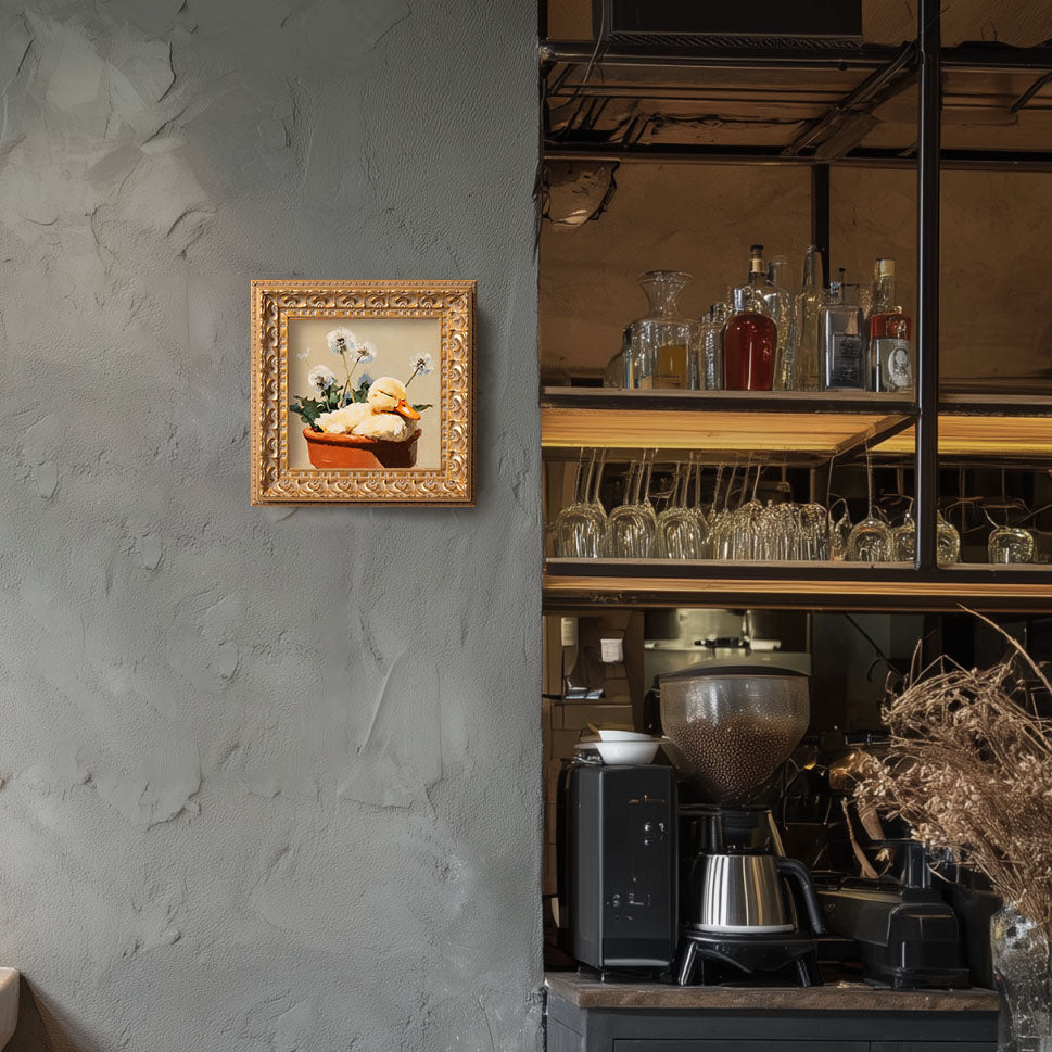 Small Original Hand Painted, Duckling in Flower Pot Oil Painting, Living Room Wall Art Decor, 5X5 Gold Framed Artwork, Christmas Gift
